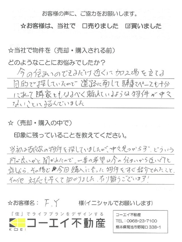 当初は古民家の家を探していましたが、なかなか見つからず、どういう所が良いかと聞かれたので、一番の希望は今の住まいから近い所と話したらその場で今回購入に至った物件をすぐに紹介されたこと。その他、対応も早くて助かりました。有難うございます。