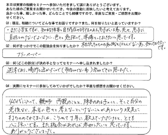 40代に入って、両親のことと障がいのある子のこと、そして自分の老後など、本当にいろいろと考えないといけないことがあるという現実に打ちのめされていましたが、こうやって丁寧に教えていただけるととても心強いです。また機会があれば参加したいと思っています。ありがとうございました。